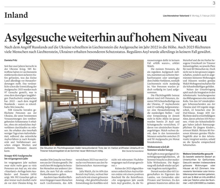 In the reporting year, 231 people from Ukraine were granted S protection status, i.e. temporary protection in Liechtenstein. Two people were granted temporary admission. At the same time, not a single person was recognized as a refugee in Liechtenstein through the regular asylum procedure. Due to the ongoing tense situation in Ukraine, the VAC is in favor of retaining "S" protection status for refugees from Ukraine.