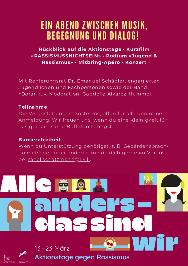Der Anlass «Alle anders – das sind wir» findet im Rahmen des Internationalen Tags gegen Rassismus am 21. März statt. Die Veranstaltung wird von der Offenen Jugendarbeit, der Schulsozialarbeit, dem «aha» - Tipps und Infos für junge Leute und der Abteilung Chancengleichheit (ASD) organisiert und findet ab 16.30 Uhr im Jugendtreff Camäleon in Vaduz statt. Anschliessend gibt es einen «Mitbring-Apéro».
