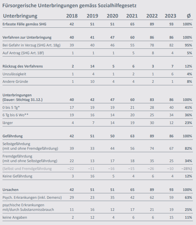 Bei der Fürsorgerischen Unterbringung (früher Zwangseinweisung) handelt es sich um einen sehr sensiblen Eingriff in das Grundrecht der persönlichen Freiheit. Die Anzahl der fürsorgerischen Unterbringungen in Liechtenstein hat sich in den letzten 20 Jahren vervierfacht. Der VMR dokumentiert die Fürsorgerischen Unterbringungen seit 2018. 95 Prozent aller fürsorgerischen Unterbringungen erfolgen bei Gefahr in Verzug durch die diensthabenden Ärzte und Ärztinnen und werden gerichtlich überprüft. Fast 90 Prozent aller fürsorgerischen Unterbringungen in diesem Zeitraum stehen in Zusammenhang mit psychischen Erkrankungen. Praktisch alle Fürsorgerischen Unterbringungen werden in Kliniken in der Schweiz und im Ausland vorgenommen.