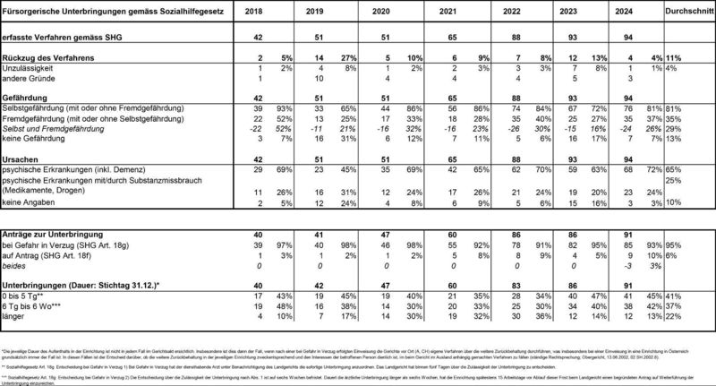 Gemäss Sozialhilfegesetz muss eine Zurückbehaltung immer zweckdienlich und im Interesse der betroffenen Person sein. Eine transparente und regelmässige Überprüfung der Massnahmen ist verpflichtend. Das Landgericht prüft spätestens sechs Monate nach Beginn der Unterbringung, ob die Voraussetzungen weiterhin erfüllt sind, basierend auf Berichten der Klinik, unabhängigen Gutachten und Anhörung der Person. Die betroffene Person kann jederzeit ihre Entlassung beantragen, worüber unverzüglich schriftlich entschieden wird. Die Detailstatistik des Landgerichts zu den fürsorgerischen Unterbringungen zwischen 2018 bis 2024 zeigt auf, dass 41 Prozent der fürsorgerischen Unterbringungen nach fünf Tagen beendet waren. 37 Prozent der Unterbringungen dauerten zwischen 6 Tagen und 6 Wochen. 22 Prozent der Unterbringungen dauerten länger als 6 Wochen.