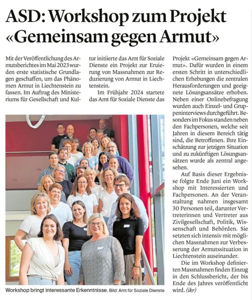 Im Berichtsjahr führte das Amt für Soziale Dienste das Projekt „Gemeinsam gegen Armut“ zur Entwicklung von Massnahmen zur Armutsbekämpfung unter Einbezug der Zivilgesellschaft durch. Nach der Befragung betroffener Organisationen und Fachpersonen sowie einem Workshop wurden im Schlussbericht drei Massnahmen identifiziert: Die Weiterentwicklung und Neupositionierung des Runden Tisches Armut im Laufe des Jahres 2025, die Planung und Durchführung einer Präventionskampagne durch das Amt für Soziale Dienste in den Jahren 2025-2026 und die Planung und Durchführung eines Projekts zur Erhöhung der Transparenz der staatlich angebotenen Leistungen.