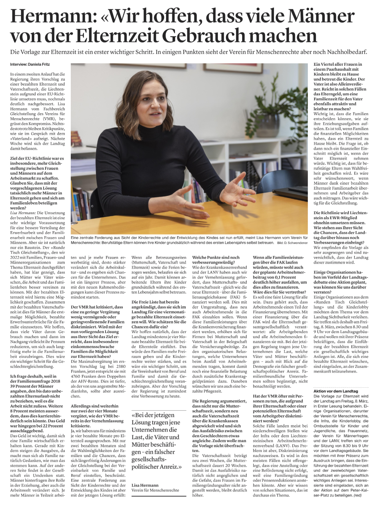 Der Landtag und verschiedene Organisationen der Zivilgesellschaft nutzten die Chance, mit der anstehenden Gesetzesrevision zur Einführung der bezahlten Elternzeit auch die Finanzierung des Mutterschaftsurlaubs zu revidieren. Diese erfolgt über die Krankenversicherung, was zu einer finanziellen Mehrbelastung von Betrieben mit schwangeren Frauen führt. In der Folge kann es zur Benachteiligung von Frauen bei der Anstellung führen, was nach Ansicht des VMR ein potenzieller Verstoss gegen das Gleichstellungsgesetz darstellt.