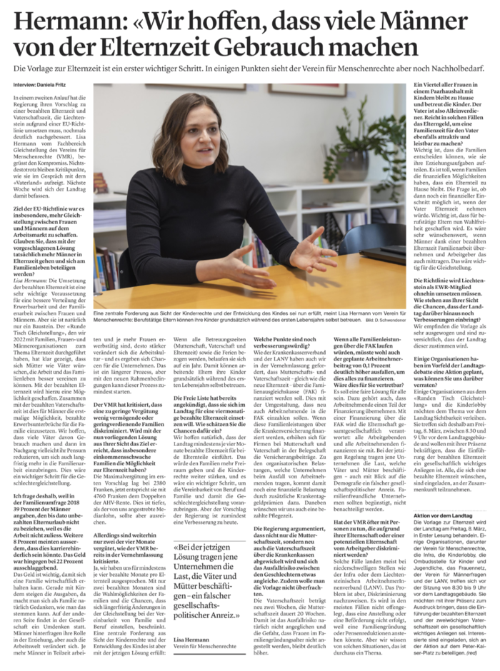 Nach mehreren Jahren des Wartens und der Vorbereitung verabschiedete der Landtag im Herbst das Gesetz zur Einführung einer bezahlten Elternzeit. Die EU hatte bereits 2019 eine Richtlinie zur bezahlten Elternzeit (EUR 2019/1158) verabschiedet, die auch in Liechtenstein umgesetzt werden muss. Die Elternzeit ist ein zentrales Element für die gleichmässigere Verteilung der bezahlten und unbezahlten Arbeit auf beide Geschlechter und damit eine wichtige Voraussetzung für Gleichberechtigung und Geschlechtergerechtigkeit.