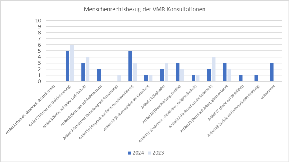Von den 32 Konsultationen zu den allgemeinen Menschenrechten gemäss Allgemeiner Menschenrechtserklärung (AEMR) betrafen je fünf das Verbot der Diskriminierung (Art. 2) und der Anspruch auf ein faires Gerichtsverfahren (Art. 10). Je drei das Recht auf Leben und Freiheit (Art. 3), das Recht auf Familie (Art. 16) und das Recht auf Arbeit (Art. 23). Je zwei auf den Anspruch auf Rechtsschutz (Art. 8), das Recht auf Asyl (Art. 14) und das Recht auf soziale Sicherheit (Art. 22). Die restlichen Konsultationen verteilen sich auf verschiedene Menschenrechte.