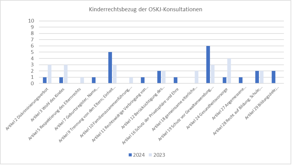 Von den 24 Konsultationen der OSKJ zu den Kinderrechten gemäss UNO-Kinderrechtskonvention betrafen sechs das Recht auf Schutz vor Gewalt (Art. 19) und fünf die Trennung von den Eltern (Art. 9). Je zwei Konsultationen betrafen die Berücksichtigung des Kindeswillens (Art. 12), das Recht auf Bildung (Art. 28) und Bildungsziele (Art. 29). Weitere Konsultationen betrafen das Diskriminierungsverbot (Art. 2), das Wohl des Kindes (Art. 3), die Staatsangehörigkeit (Art. 7), die rechtswidrige Verbringung von Kindern ins Ausland (Art. 11), den Schutz der Privatsphäre (Art. 16), die Gesundheitsvorsorge (Art. 24) und angemessene Lebensbedingungen/Unterhalt (Art. 27).