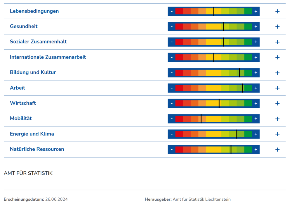 Mit der Bildungsstrategie 2025+ (SDG 4), der Energie Roadmap 2030 (SDG 7) und dem Mobilitätskonzept 2030 (SDG 9) wurden in den letzten Jahren verschiedene wichtige Umsetzungsstrategien verabschiedet. Die Entwicklung aller Nachhaltigkeitsziele beobachtet die Regierung anhand von 55 Indikatoren im jährlich publizierten Nachhaltigkeitsbericht «Indikatoren für eine nachhaltige Entwicklung». Der Bericht veranschaulicht für das Berichtsjahr, dass die Entwicklung in sechs der zehn Themenbereichen (Gesundheit, Sozialer Zusammenhalt, Bildung und Kultur, Arbeit, Energie und Klima sowie Natürliche Ressourcen) positiv oder leicht positiv verlief. Demgegenüber zeigt der Bereich Mobilität eine leicht negative Tendenz. In den Bereichen Lebensbedingungen, Internationale Zusammenarbeit und Wirtschaft wurden keine wesentlichen Veränderungen festgestellt. Insgesamt stellt der Bericht bei 34 Indikatoren positive, bei 14 negative und bei 7 neutrale Tendenzen fest.