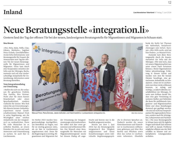 Im Juni 2024 öffnete die Beratungsstelle integration.li ihre Türen. Sie bietet an drei Tagen in der Woche Sozialberatungen sowie individuelle Begrüssungsgespräche in diversen Sprachen an. Ebenfalls berät die Stelle bei Themen wie Aufenthalt, Sozialversicherungen oder Arbeit. Die Beratungsstelle wird gemäss Leistungsvereinbarung mit dem Amt für Soziale Dienste gemeinsam von der Stiftung Mintegra und der infra geleitet. Bereits bei der Ausarbeitung der Integrationsstrategie hat der VMR eine solche Stelle gefordert, beim Integrationsdialog 2022 auch die betroffene Wohnbevölkerung. Der VMR begrüsst daher sehr, dass die Beratungsstelle nun ihre Tätigkeit aufgenommen hat. Gleichzeitig wurde die Informationsplattform integration.li überarbeitet, ergänzt und in mehrere Sprachen übersetzt.